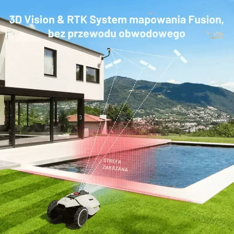 Automatyczne mapowanie pozwala stworzyć wirtualną mapę ogrodu już podczas pierwszego cyklu pracy. Stacja referencyjna RTK działa w promieniu do 3 km i zapewnia stabilny sygnał potrzebny do precyzyjnego koszenia.