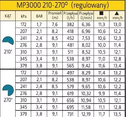 MP Rotator 3000 210°-270° umożliwia regulację kąta i promienia zraszania (dyszę można regulować tylko wtedy, gdy płynie woda). Wewnętrzny filtr siatkowy oraz funckja podwójnego wysokoku zapewniają dodatkową ochronę przez zapychaniem się dyszy.