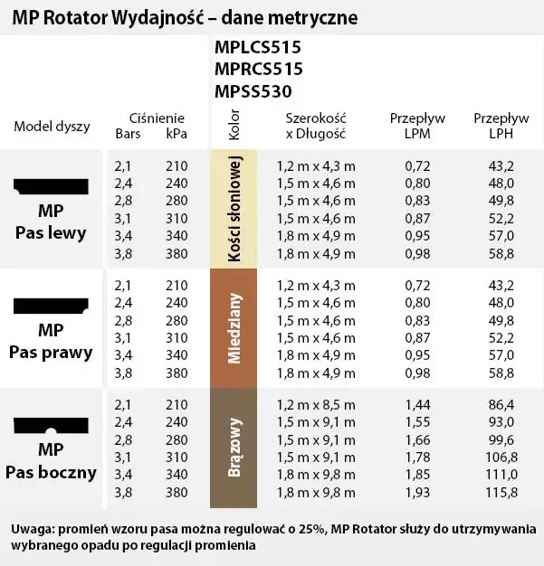 - Mały wydatek, niska wartość opadu – ze względu na niski wydatek wody większa ilość dysz MP Rotator może zostać połączona na jednej sekcji w porównaniu do innych rozwiązań na rynku. Ze względu na niską wartość opadu system oparty o dysze rotacyjne pozwala na największą wydajność przy małych stratach wody.