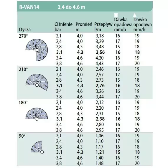 Dysza rotacyjna Rain Bird R-VAN 14 o zasięgu 2,4 – 4,6 m i ręcznym ustawieniem kąta pracy od 45° do 270° to innowacyjne rozwiązanie poszerzające asortyment zraszaczy rotacyjnych o kolejne, niedostępne wcześniej zasięgi. Dysza posiada idealną proporcję wydatku wody do możliwości absorpcyjnych gleby. Dzięki precyzji pokrycia pozwalającej znacznie skrócić czas nawadniania oraz zmniejszonemu przepływowi użytkownik oszczędza do 60% wody. Pracująca dysza tworzy grube strumienie wody, które są wyjątkowo odporne na podmuchy wiatru. Regulacja dyszy nie wymaga żadnych dodatkowych narzędzi.