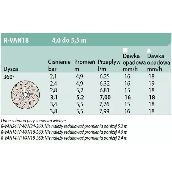 Pełnozakresowa dysza rotacyjna Rain Bird R-VAN 18 o zasięgu 4,0 – 5,5 m i stałym kącie pracy 360° to innowacyjne rozwiązanie poszerzające asortyment zraszaczy rotacyjnych o kolejne, niedostępne wcześniej zasięgi. Dysza posiada idealną proporcję wydatku wody do możliwości absorpcyjnych gleby. Dzięki precyzji pokrycia pozwalającej znacznie skrócić czas nawadniania oraz zmniejszonemu przepływowi użytkownik oszczędza do 60% wody. Pracująca dysza tworzy grube strumienie wody, które są wyjątkowo odporne na podmuchy wiatru. Regulacja dyszy nie wymaga żadnych dodatkowych narzędzi.