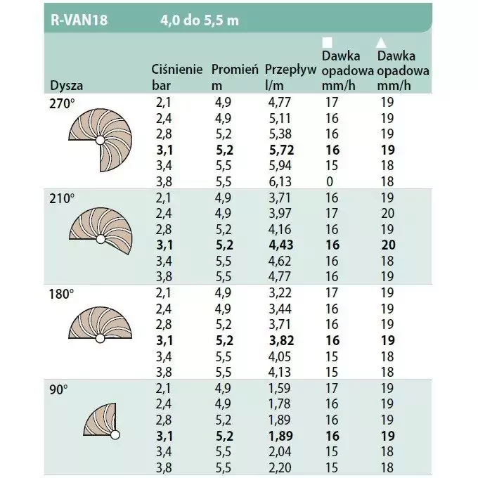 Dysza rotacyjna Rain Bird R-VAN 18 o zasięgu 4,0 – 5,5 m i  ręcznym ustawieniem kąta pracy od 45° do 270° to innowacyjne rozwiązanie poszerzające asortyment zraszaczy rotacyjnych o kolejne, niedostępne wcześniej zasięgi. Dysza posiada idealną proporcję wydatku wody do możliwości absorpcyjnych gleby. Dzięki precyzji pokrycia pozwalającej znacznie skrócić czas nawadniania oraz zmniejszonemu przepływowi użytkownik oszczędza do 60% wody. Pracująca dysza tworzy grube strumienie wody, które są wyjątkowo odporne na podmuchy wiatru. Regulacja dyszy nie wymaga żadnych dodatkowych narzędzi.