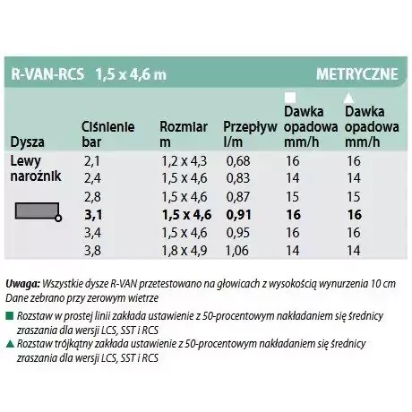 Charakterystyka dyszy rotacyjnej R-VAN RCS, Rain Bird
