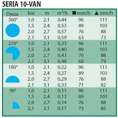 Charakterystyka dyszy Rain Bird 10-VAN: