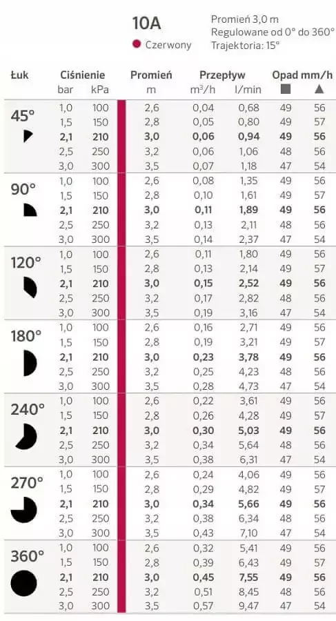 Dysza statyczna 10A Hunter gwarantuje precyzyjne nawadnianie w zakresie od 2,6 do 3,5 m. Idealnie nadaje się do stosowania na małych, nieregularnych trawnikach a także w rabatach. Dysze Hunter PRO o regulowanym kącie pracy umożliwiają użytkownikowi nawadnianie obszaru o dowolnym kształcie z dokładnością jaką oferują dysze o stałym kacie pracy. Zmiany kąta w zakresie 0° do 360° można wykonywać ręcznie, bez jakichkolwiek narzędzi.